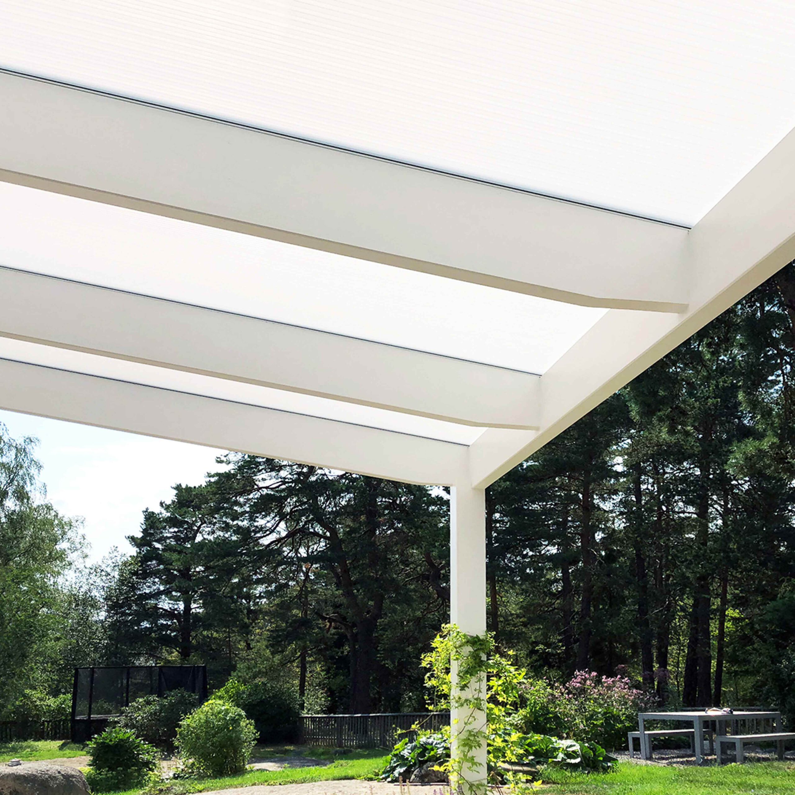 Vid montering av ett tak med vägganslutning använder man en vägganslutning för att täta mellan uterummets tak och husets vägg. Denna plåt är vitlackerad.