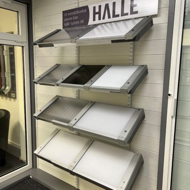 Prover på Halle kanalplasttak, glastak & PC-tak inklusive profiler till taken.