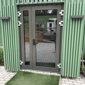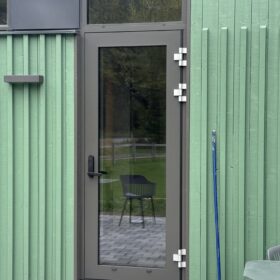 Halle glasfasad arkitektritat hus med glaspartier och dörr tillverkade av Halle